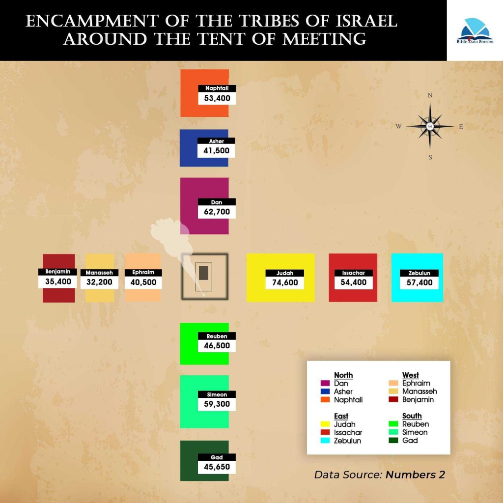 There are 2 major censuses conducted in the book by Moses and they are the central theme of this blog post. We are going to examine some similarities and differences in both of them. The book basically opens with the first one in Numbers 1. We are told that God commanded Moses to do a census in Israel and count the number of males who were 20 years and above and were capable of going to war. They were to be counted according to clans and ‘fathers’ houses’. The tribe of Levi was to be excluded because they were given the charge to take care of the tabernacle. At the end of the first census, Moses counted 603,550 men. This census was conducted by Moses and Aaron in the wilderness of Sinai. The visualization above is a representation of the data collected by Moses and how the tribes of Israel encamped around the tent of meeting.