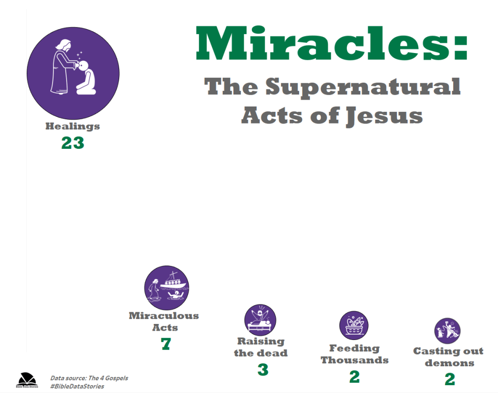 In the visualization above, we have a summary of the supernatural acts of Jesus. The bible mentions that Jesus did many miraculous things that were not written. However, the ones that were written with accompanying details have been visualized above. In the book of Luke alone, there is a record of 3 different instances that Jesus healed an unstated number of people in 3 separate meetings. In Luke 4:40 it is written that he laid his hands on a number of people and healed them of all their diseases and sicknesses. The setting of this narrative gives us the impression that it wasn’t a great number of people: Jesus had visited Simon Peter at home to heal his mother-in-law then at sun set the people in the vicinity started bringing in their sick relatives and friends for healing. However, in the second instance in Luke 6:19, Jesus was in the midst of a great multitude. The term “great multitude” is tautological because a multitude is a large number of people hence for the Bible to describe the crowd as such indicates the size of the gathering and perhaps that the number of people there was uncountable. In this case, since the number of people gathered was huge, Jesus didn’t lay hands on them. The Bible says “…power came out of him and healed them all”. It could have been 200 people who were healed that day; it could have been 700 or even a thousand. We cannot tell. All we know is that Jesus had the power to heal every sick person at a meeting that attracted a “great multitude” of people. Finally, we are told in Luke 7:21 that “In that hour he healed many people of diseases and plagues and evil spirits, and on many who were blind he bestowed sight”. Again, we see that Jesus healed an unstated number of people in this gathering. The bible referred to all those who were present at this gathering as “crowds” (Luke 7:24), this gives us a fair idea of how large the gathering was and perhaps the number of people affected by the miraculous ministry of Jesus that day, because the text did say he healed “many” of them.