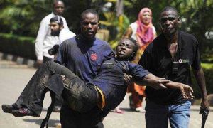 A Kenyan woman is helped to safety after shootings in a Nairobi shopping mall